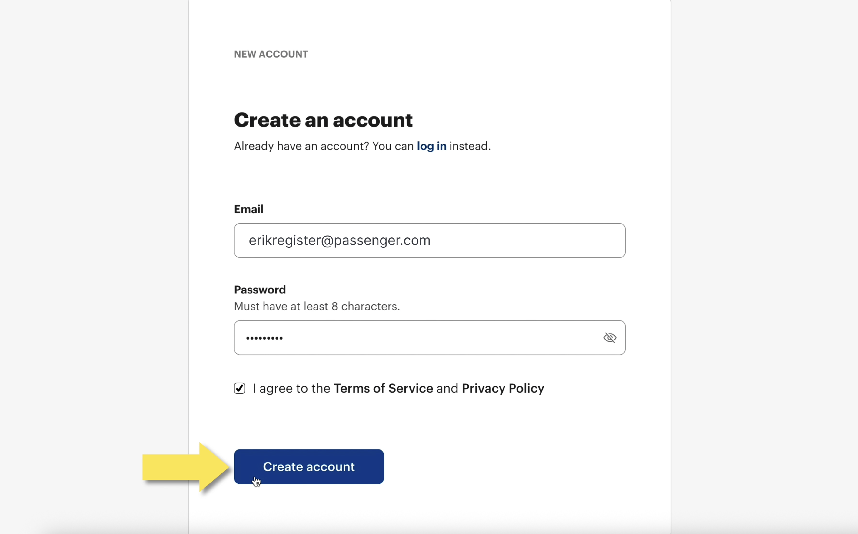 If this is your first time registering for a trip on this platform, you'll need to create an account. Add your email address, create a password, agree to the terms, and click the Create account button.
