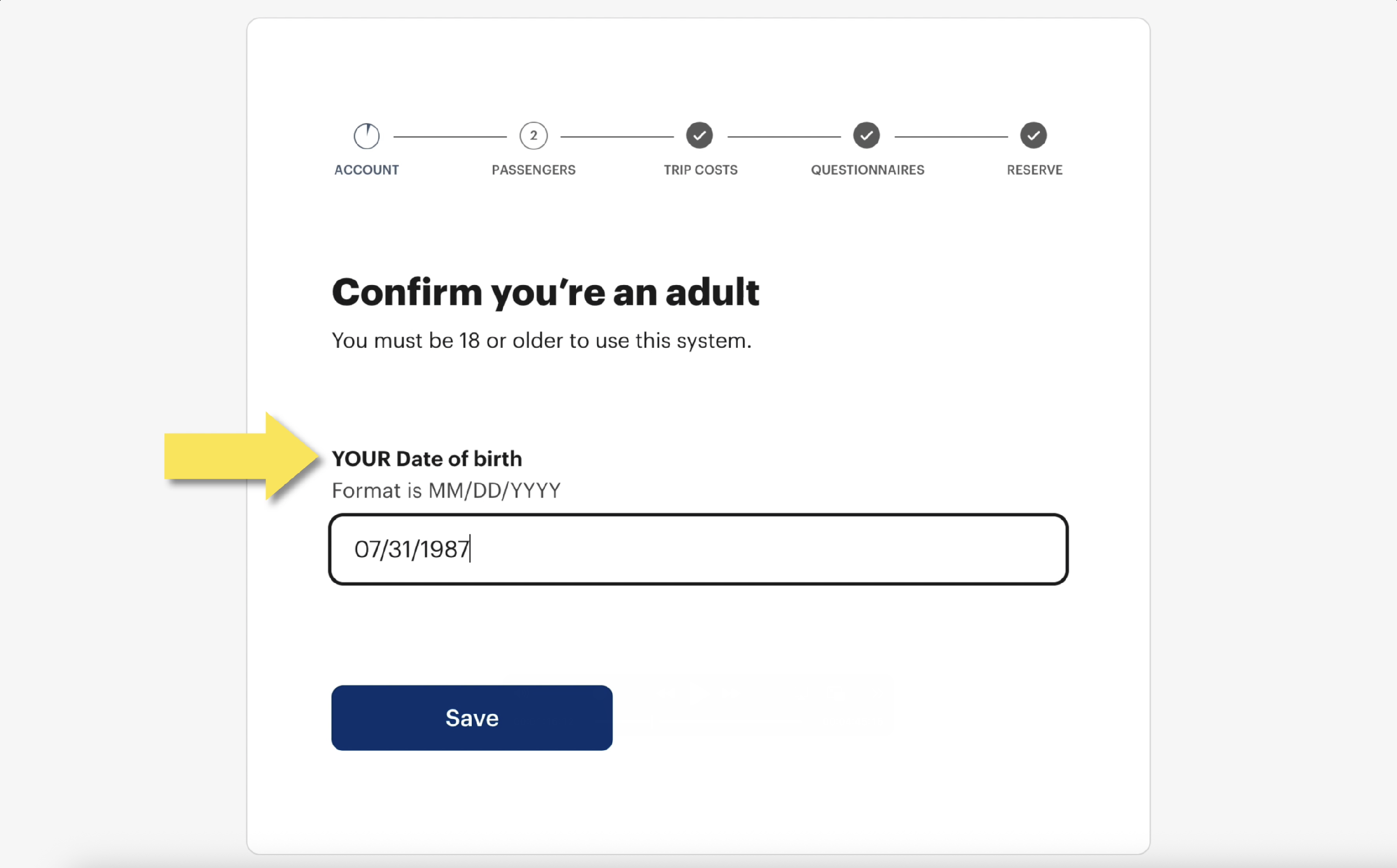 You'll be the account manager and you'll provide your child's information in the next section named Passengers. So to be clear, provide your date of birth on this page then, click Save.