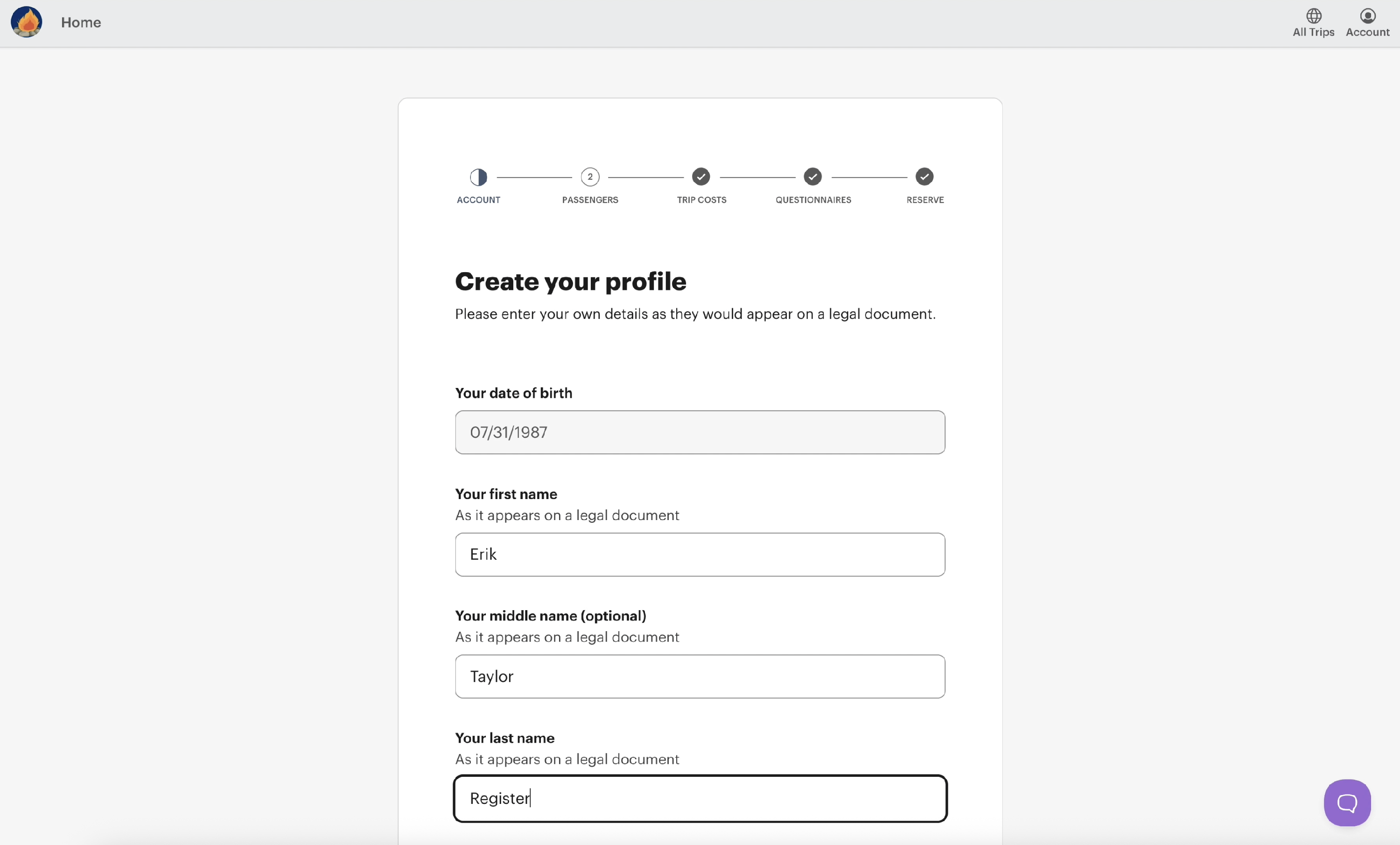 In this section you'll provide personal details to complete your account. Note: Entering your information here does not mean you're registering yourself to travel on the trip.