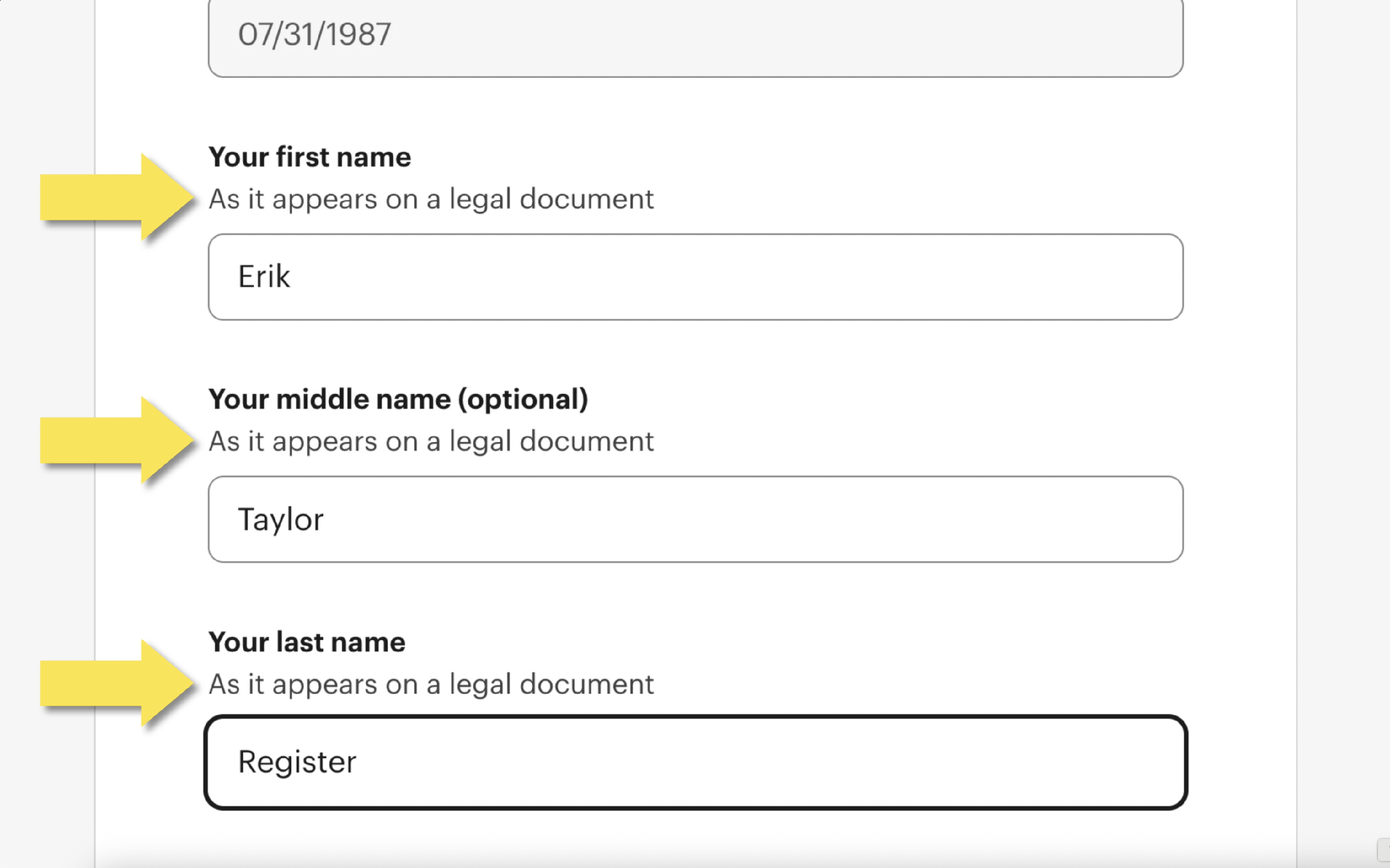 Make sure to use your name as it appears on legal documents and avoid nicknames.