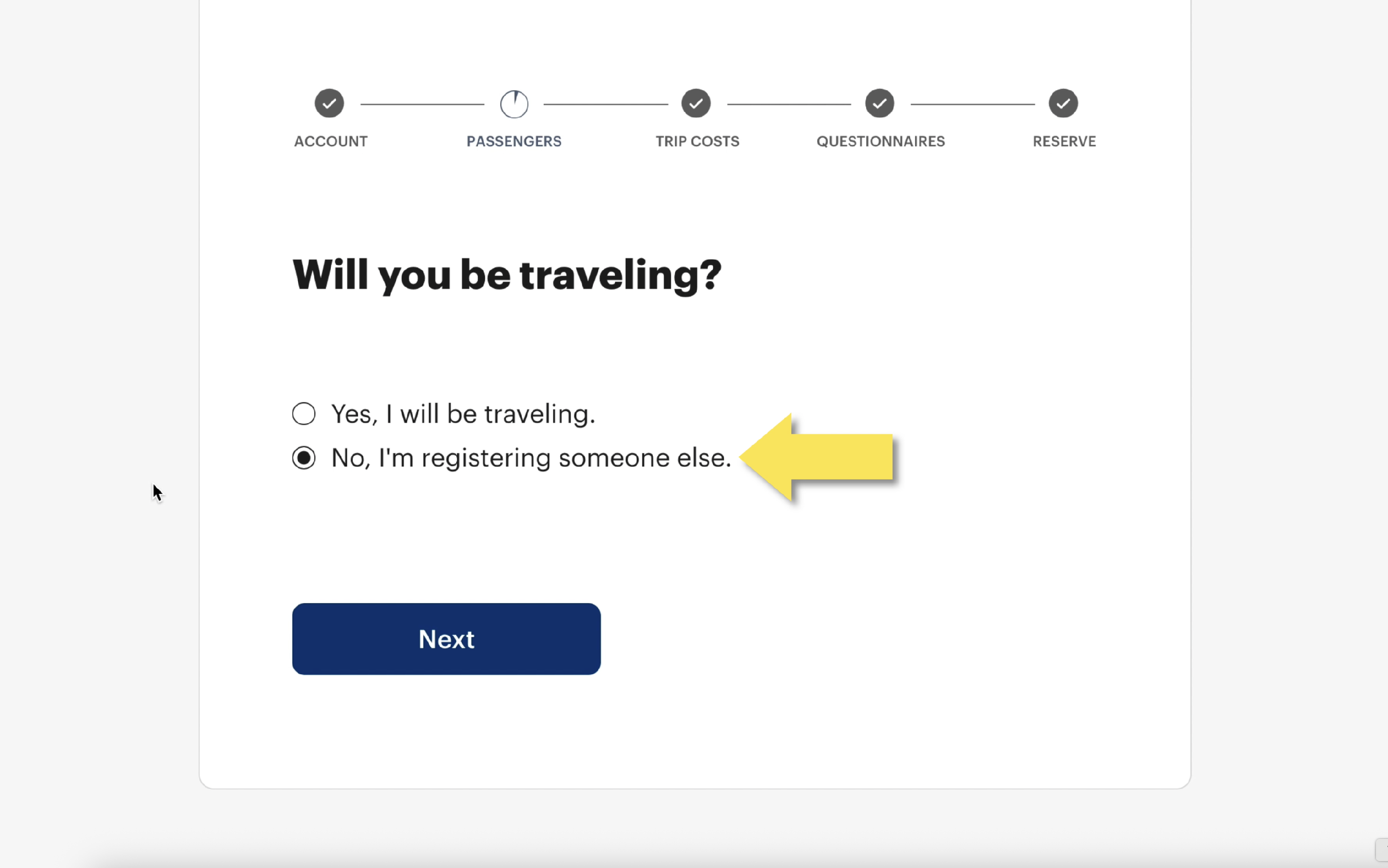 You've completed the account section! Next, you'll be asked a very important question: Will you be traveling? Since you're registering your child, we'll select No I'm registering someone else.
