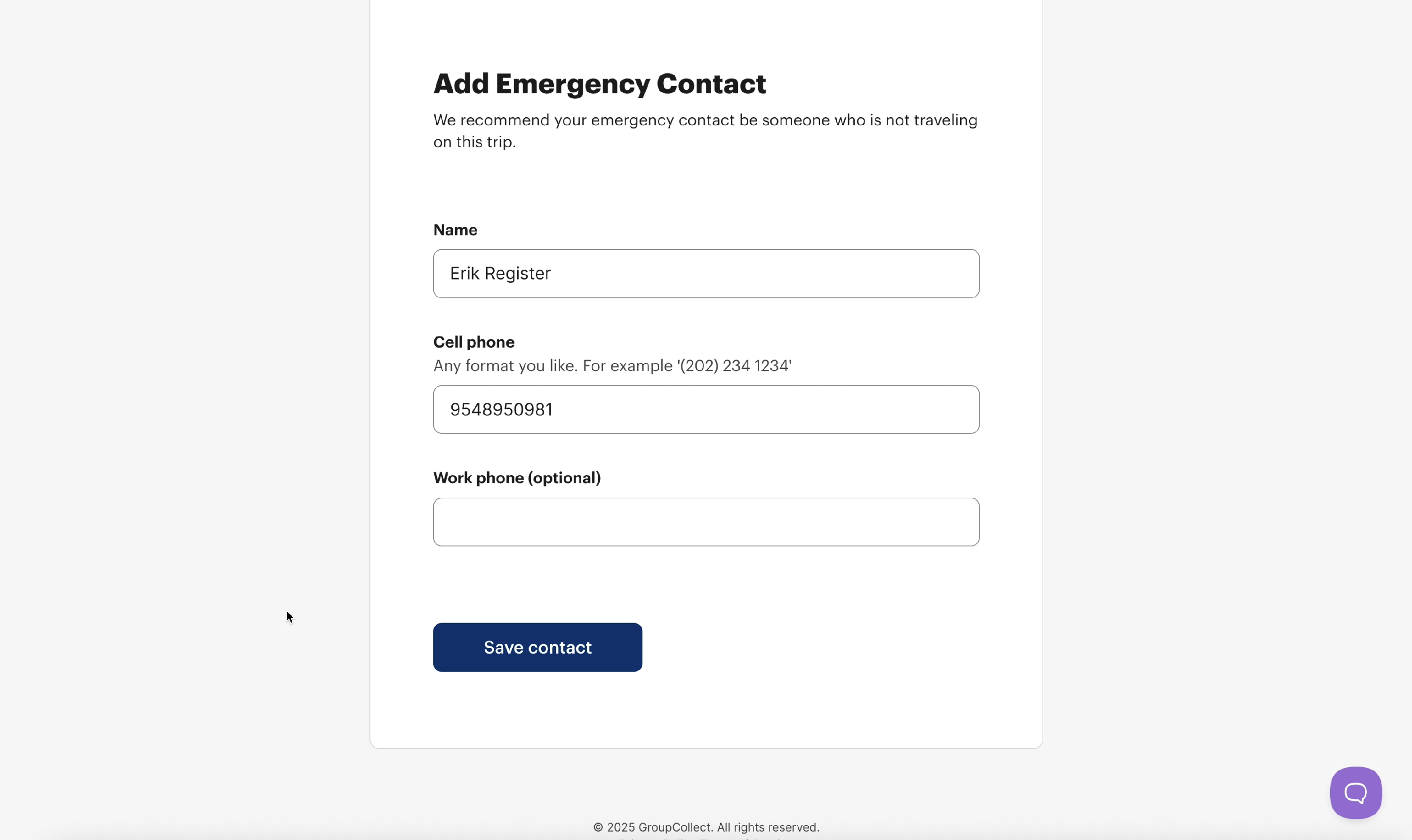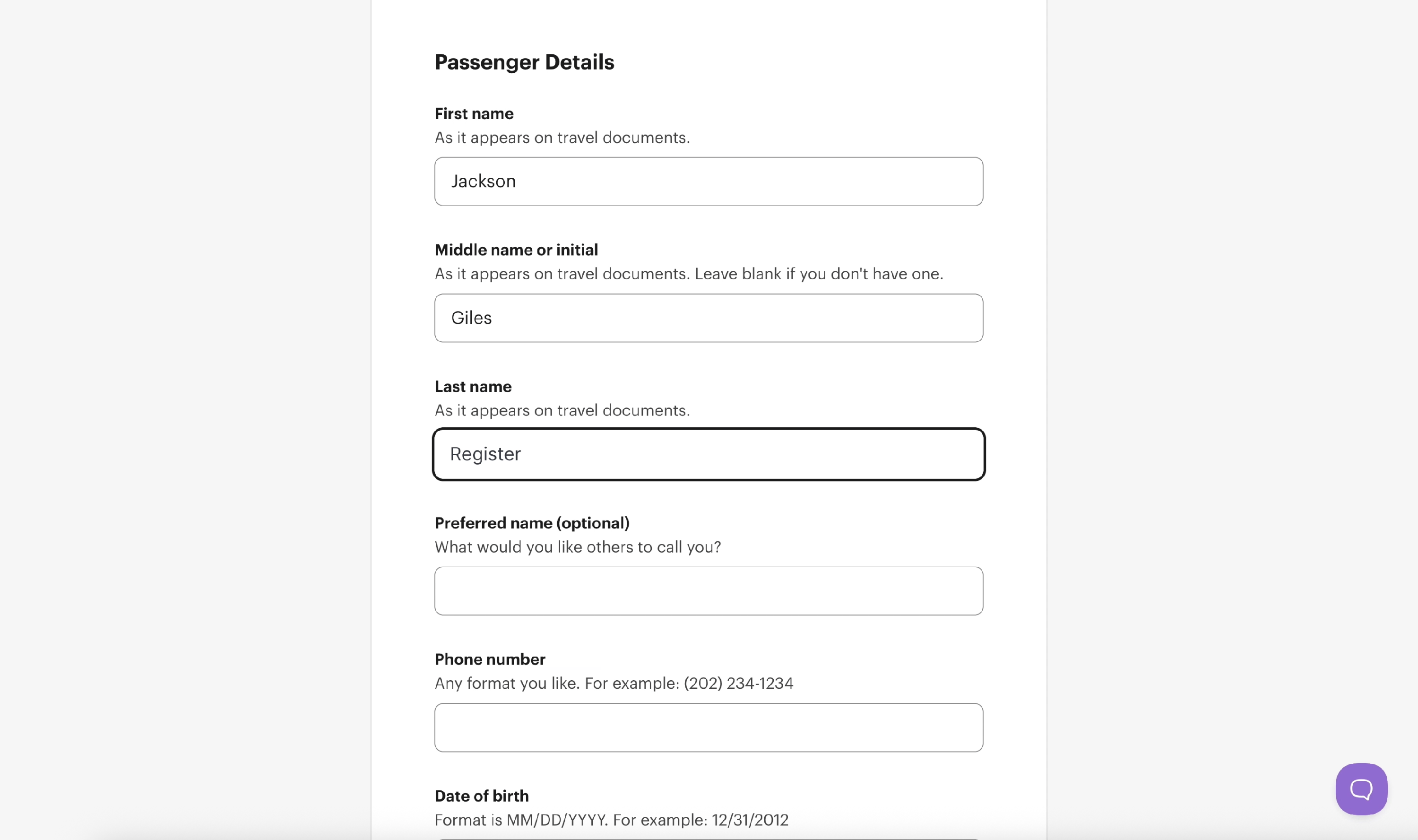 You're in the home stretch! In this final section, the first thing you'll be asked is to provide an emergency contact for the passenger. If you are the passenger's emergency contact, please provide your own contact information.