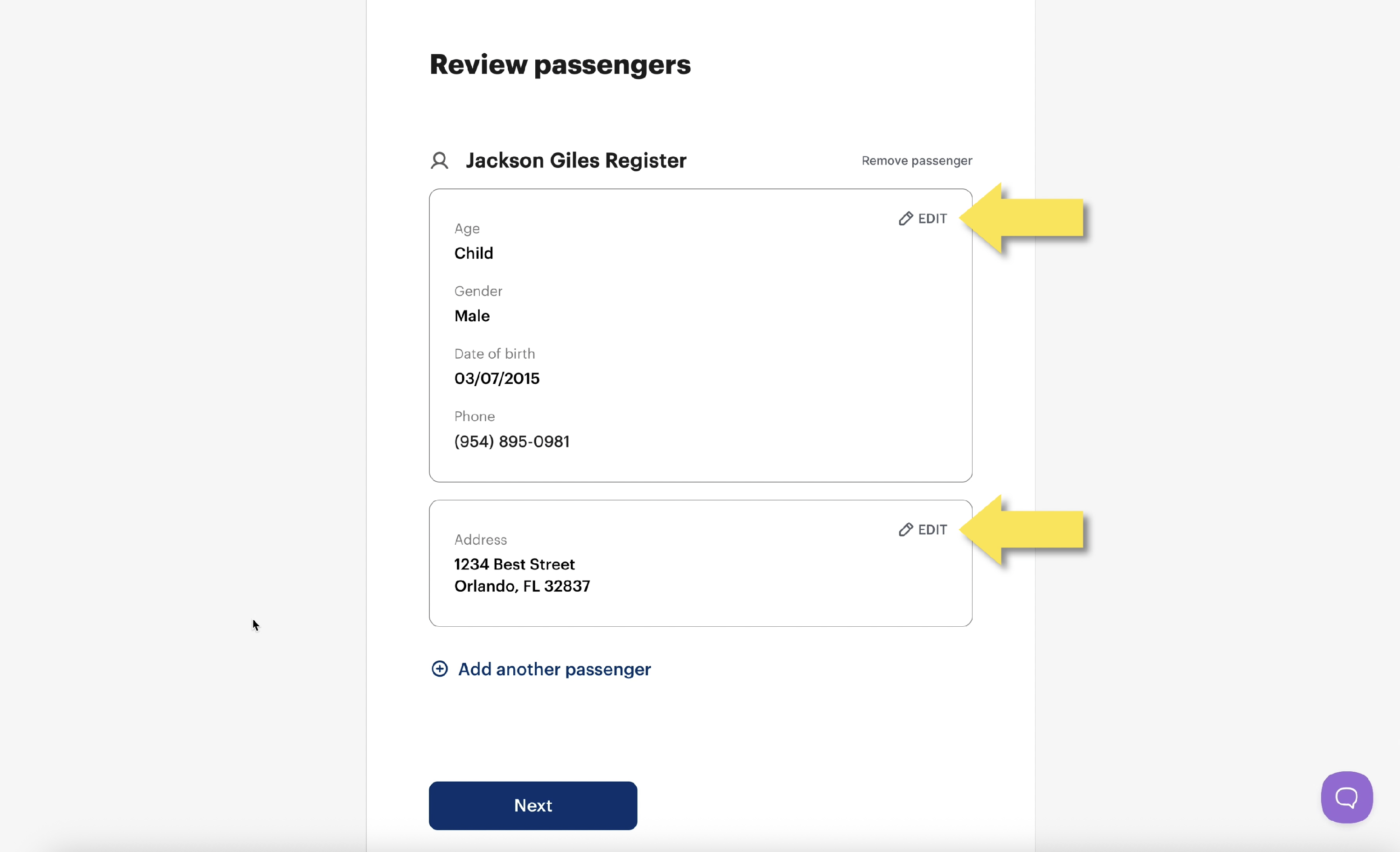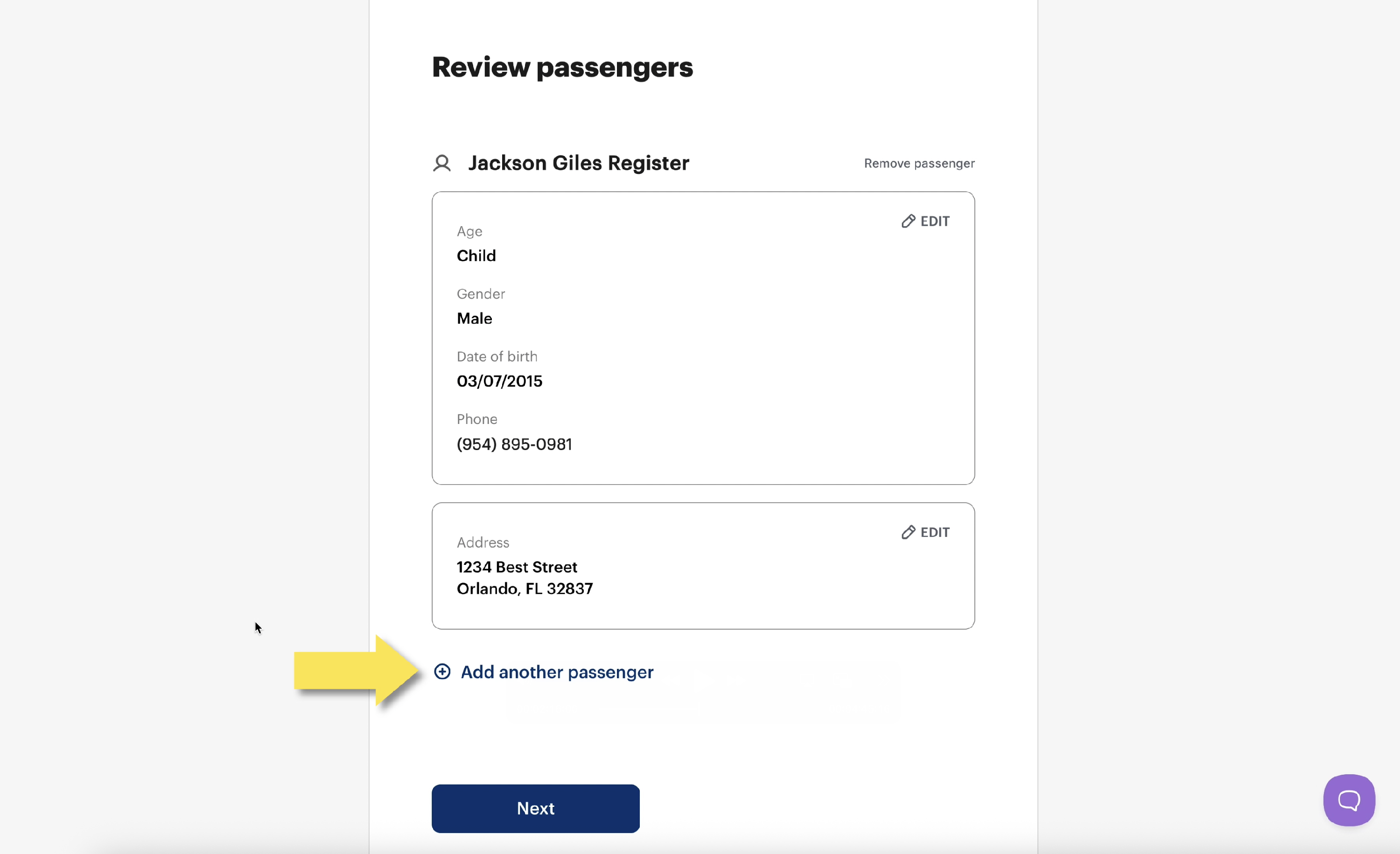 Confirm everyone you indicated as a passenger. If you need to add more passengers, click the Add another passenger link near the bottom of the page.