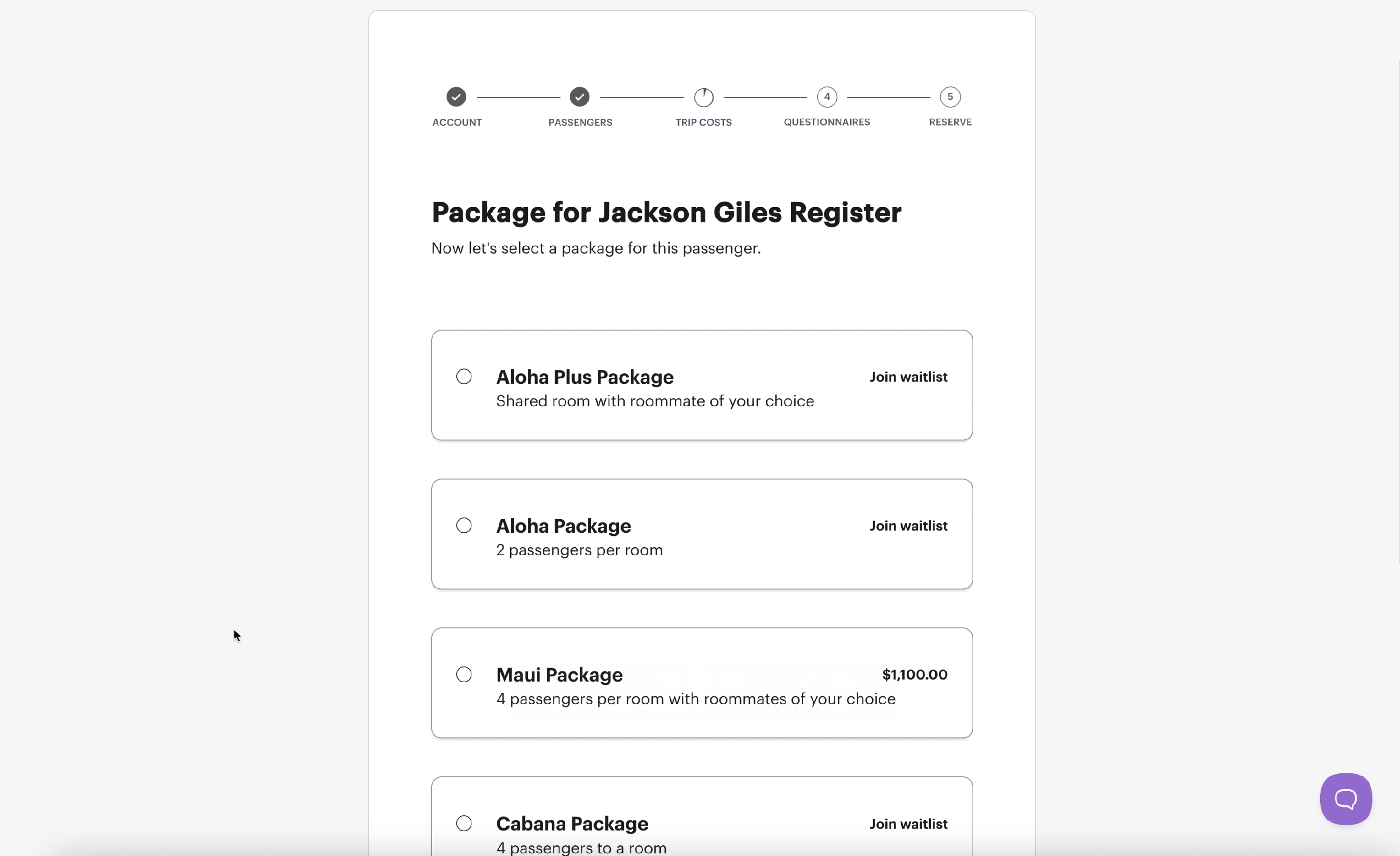 You're almost half way done with registration! In this section you'll make choices on the parts of the trip that cost money. The first will be selecting a trip package for your child. This normally indicates what kind of rooming accommodations they'll have for this trip.