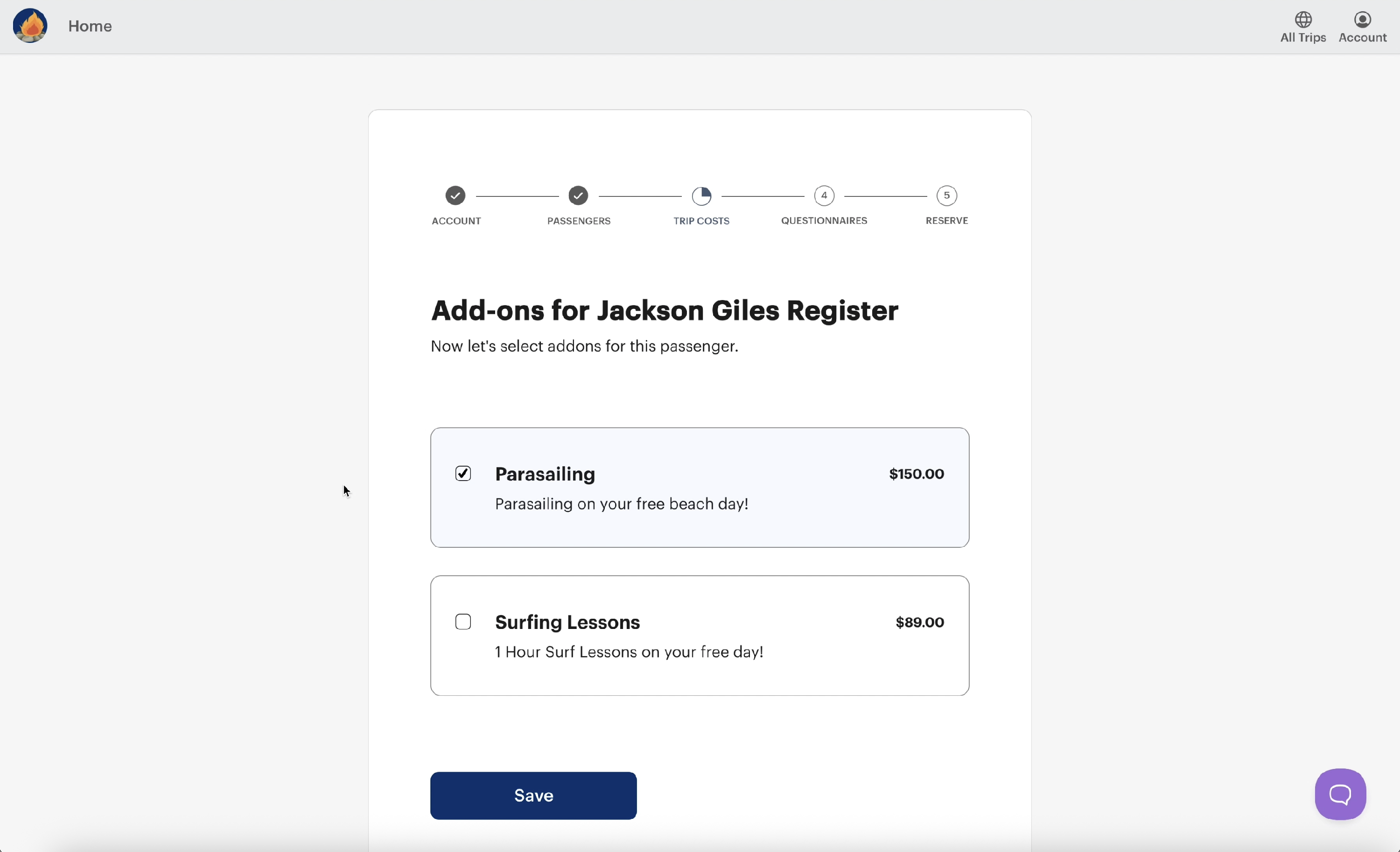 Next, select any trip add-ons you'd like to purchase for your child's trip. Add-ons can be anything like an extra excursions, group t-shirts, etc.