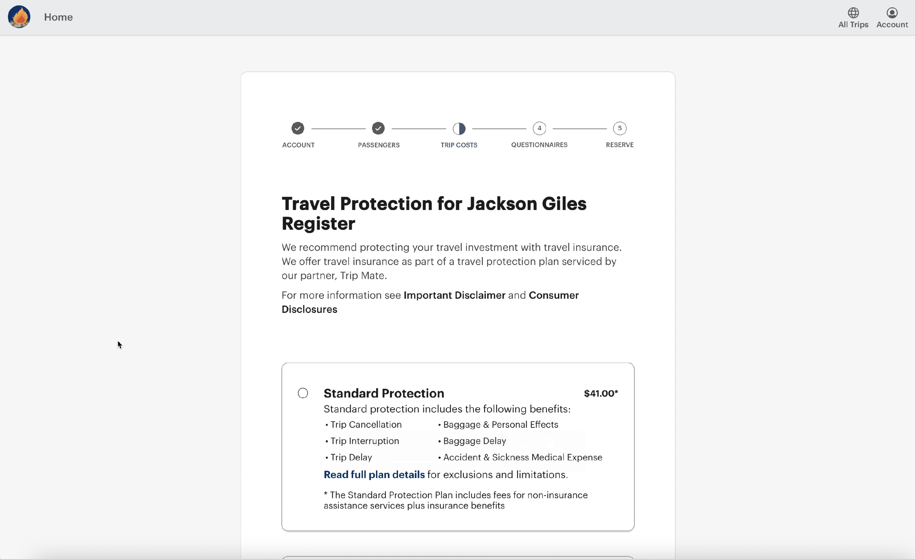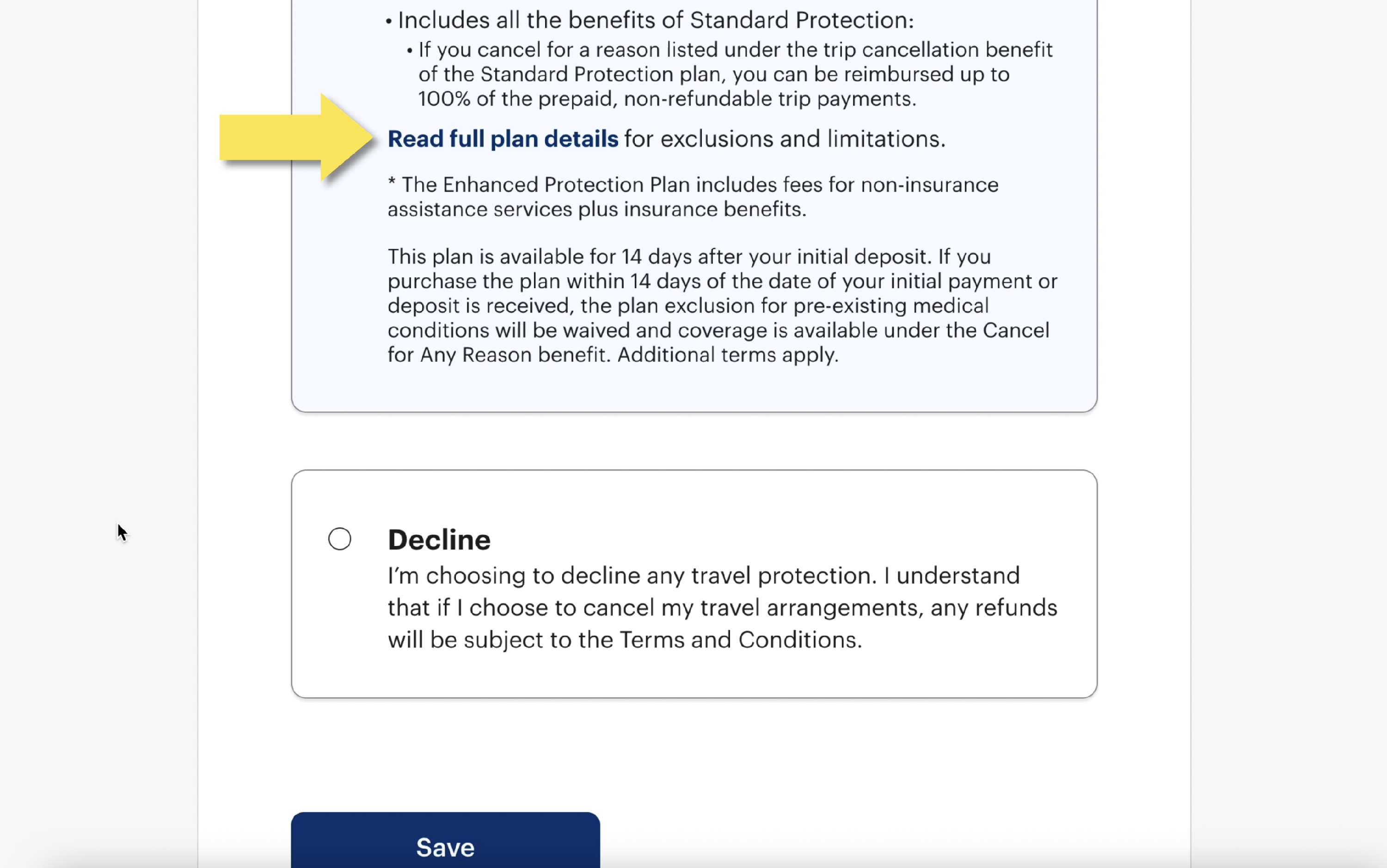 Most of the funds paid into group travel is non-refundable, however trip protection is designed to help passengers and families potentially recover a portion of those funds in the event a passenger does not travel. There are two different types of trip protection: standard and enhanced. To understand the differences in these types, click on the Read full plan details links. You also have the option to decline trip protection. Once you've made your selection, click the Save button to move on.