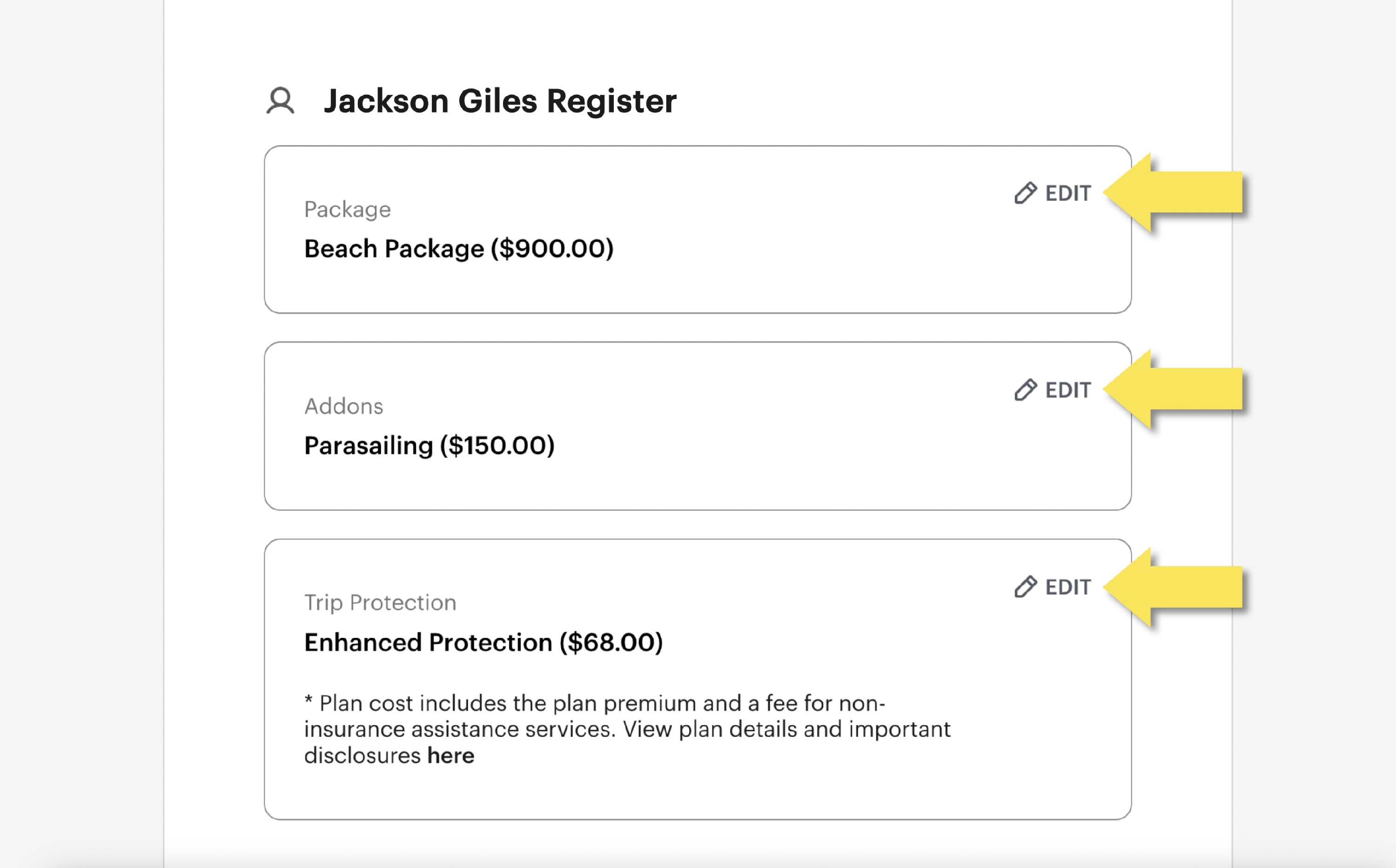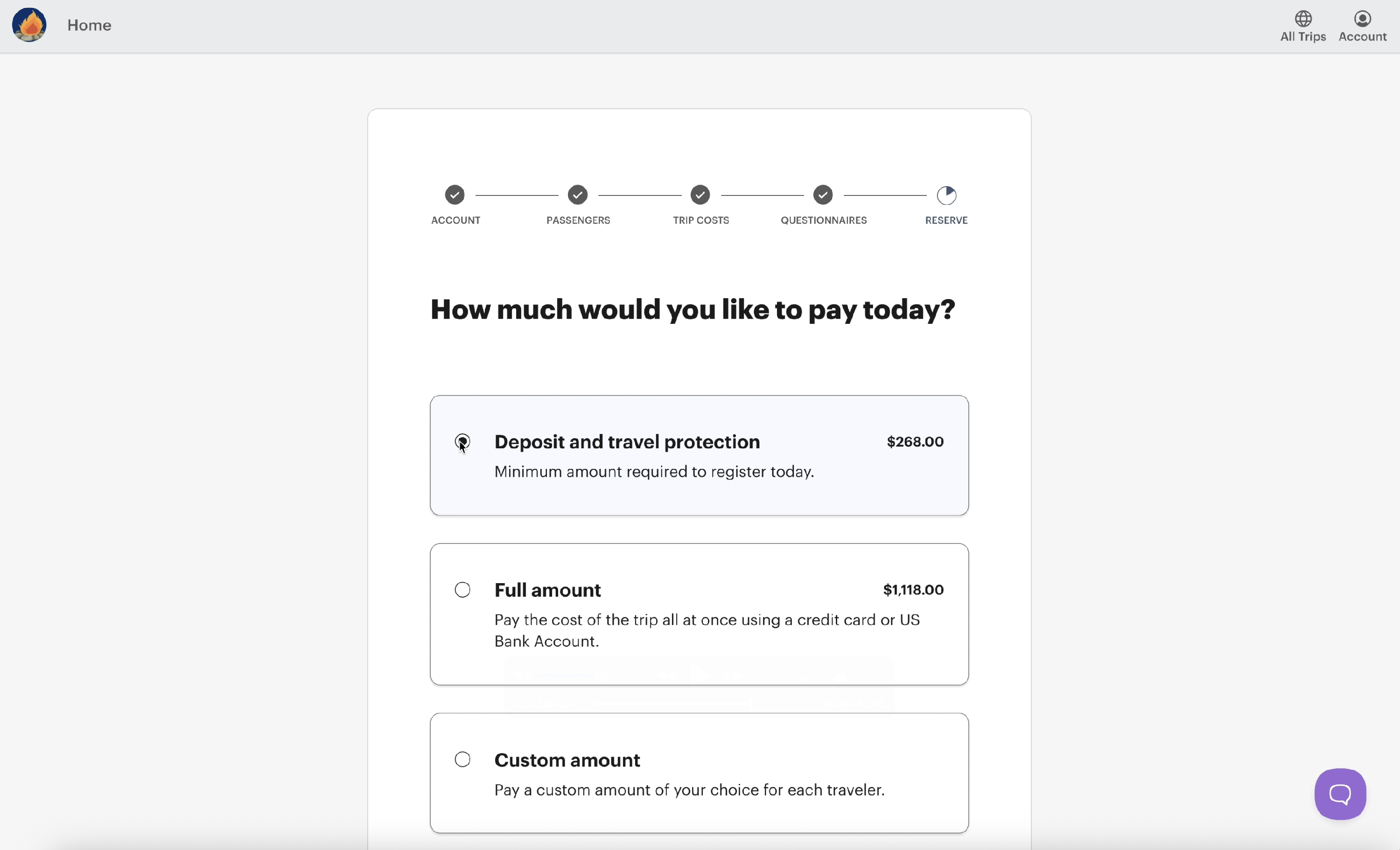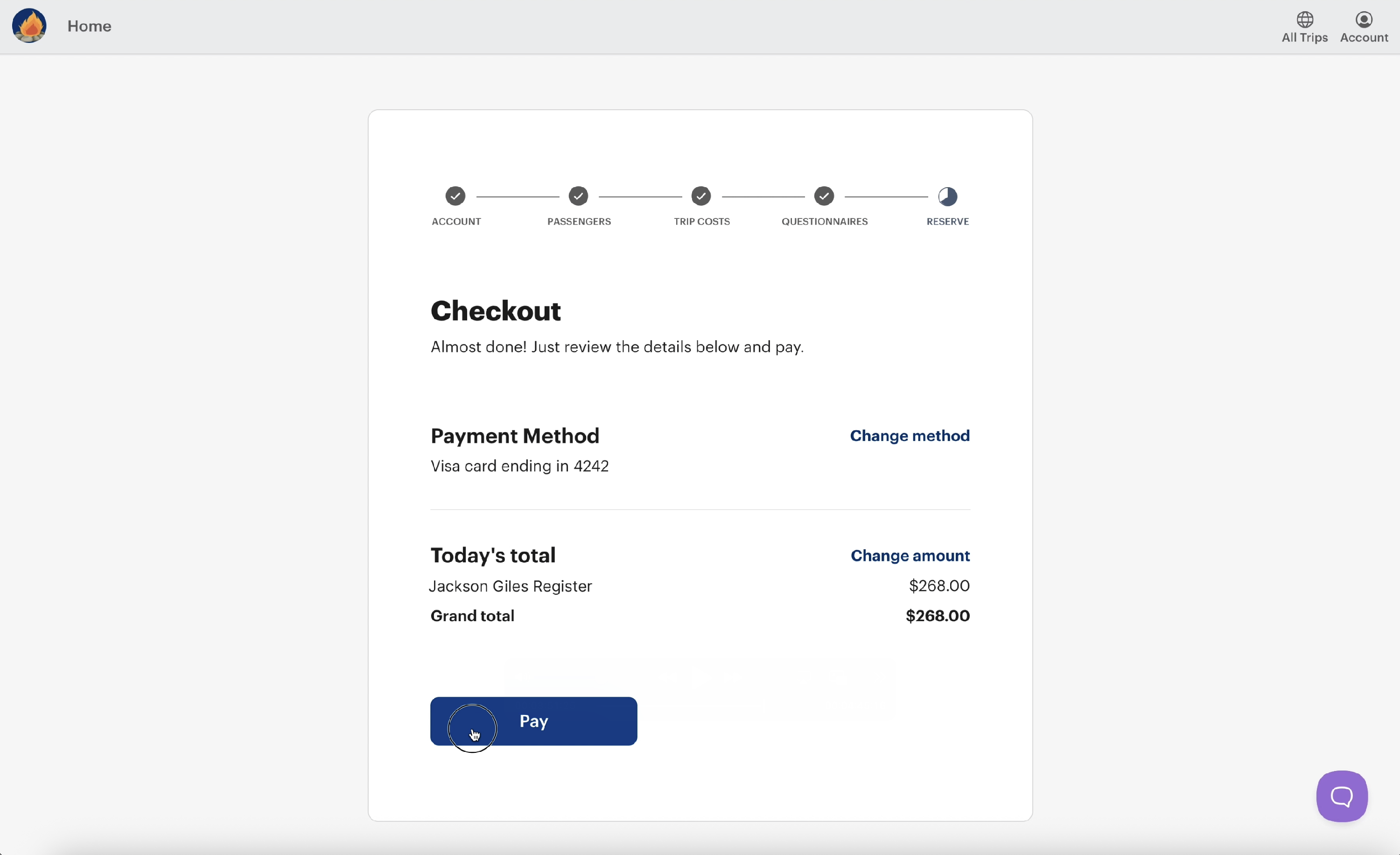 After connecting your payment method, you'll be taken to a checkout screen to review the amount due today to reserve your spot on this trip. When you are ready to execute the transaction, simply click the Pay button.
