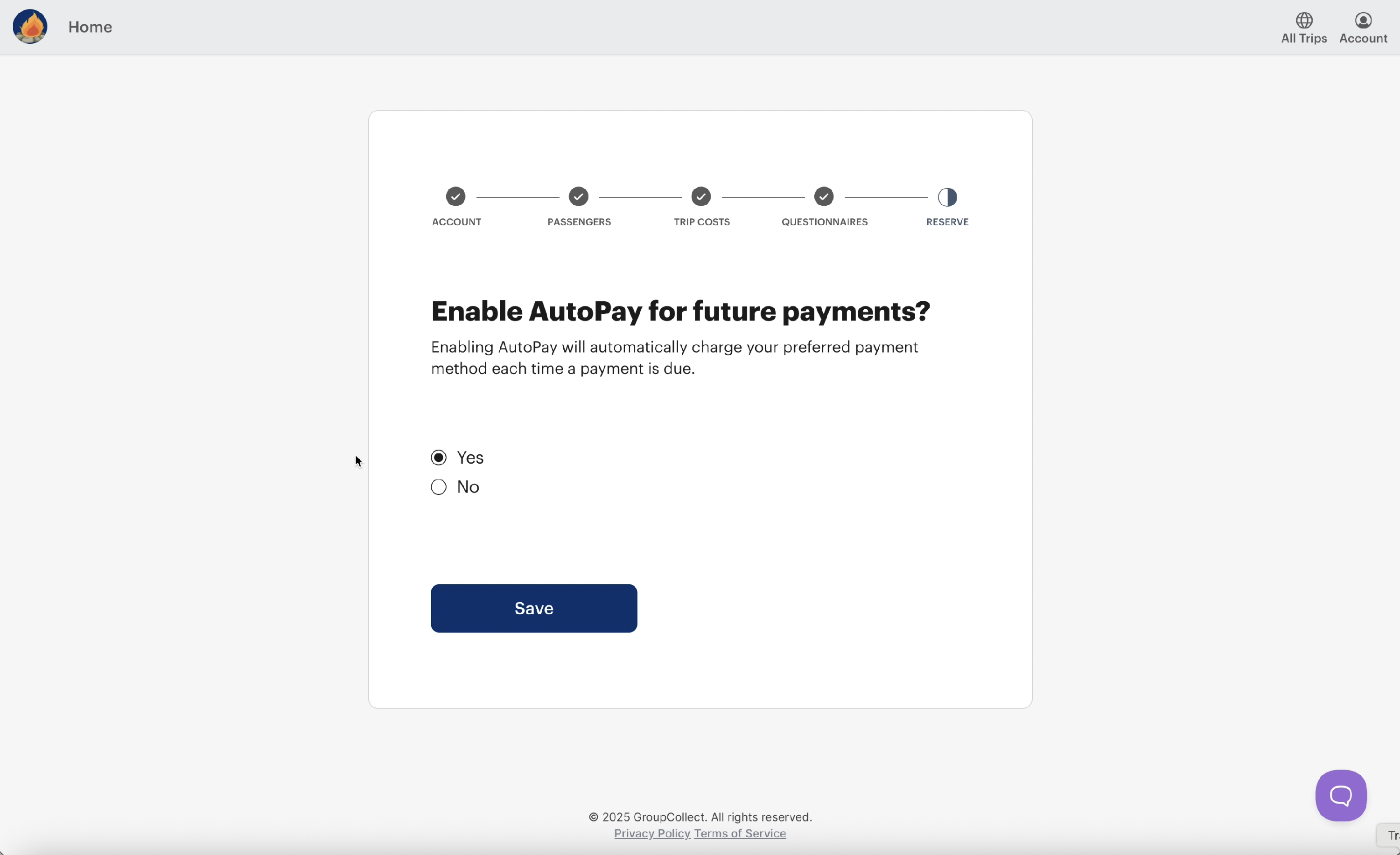 The next screen will ask if you'd like to enable AutoPay. AutoPay will ensure that you're never late for a payment because you'll be authorizing the system to charge your default payment method each time there is a trip payment due. In the event AutoPay is enabled, you'll be notified three days prior to any charge.