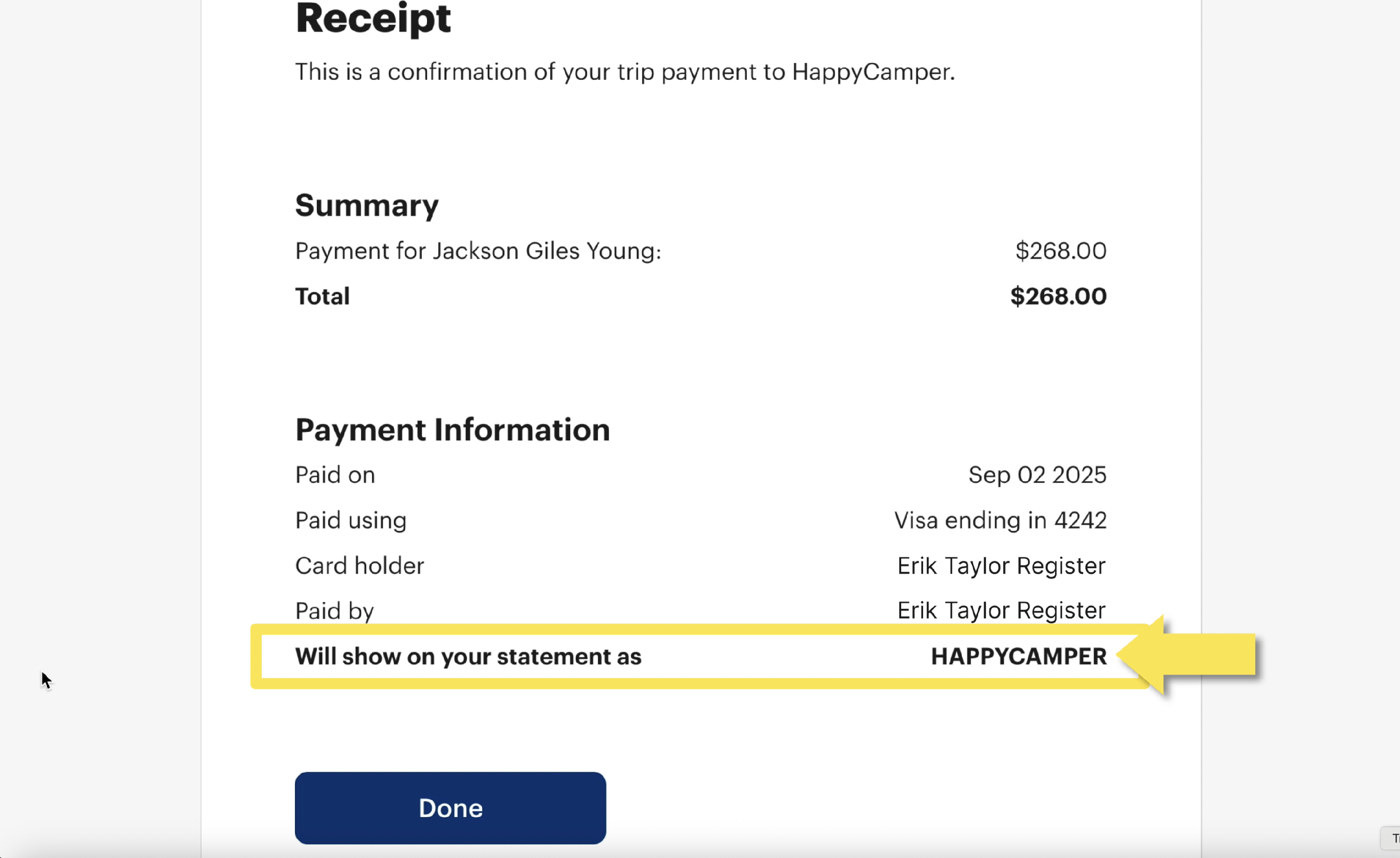 Then you'll see a payment receipt page. It will confirm the amount paid, payment method, date of payment and more. Near the bottom of the screen you'll also see how this payment will show on your bank account or credit card statement. This is so you're less likely to dispute the payment through your financial institution.