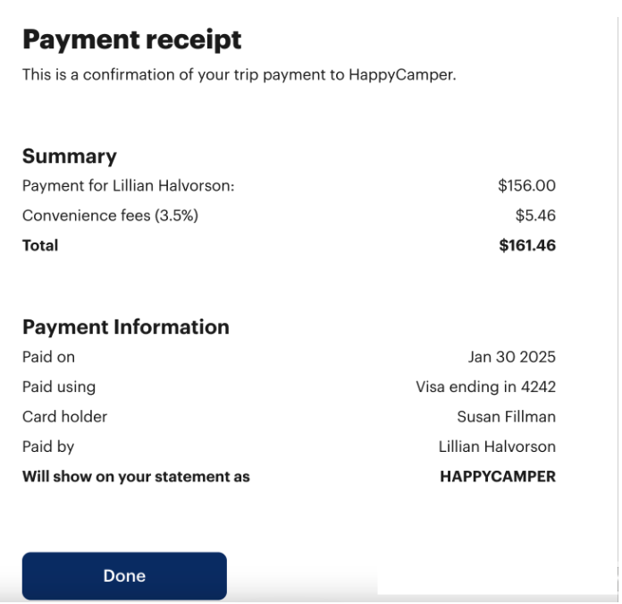 Next, you' ll see the Payment receipt page. Review the information and click Done to return back to the trip dashboard.