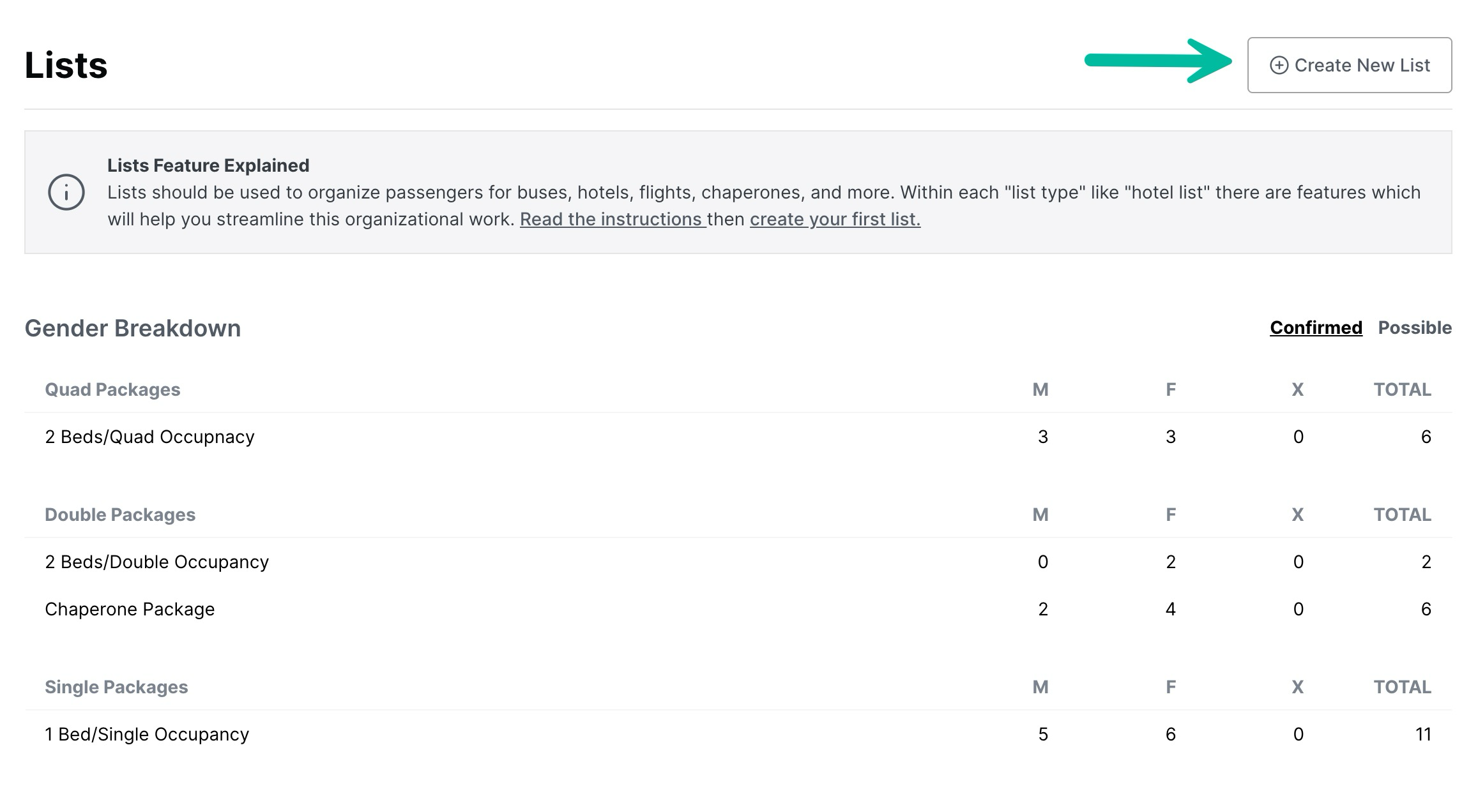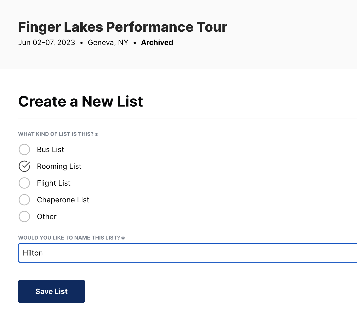 Select from the list type (Bus, Rooming, Flight, Chaperone, or Other) and name the list, then click Save.