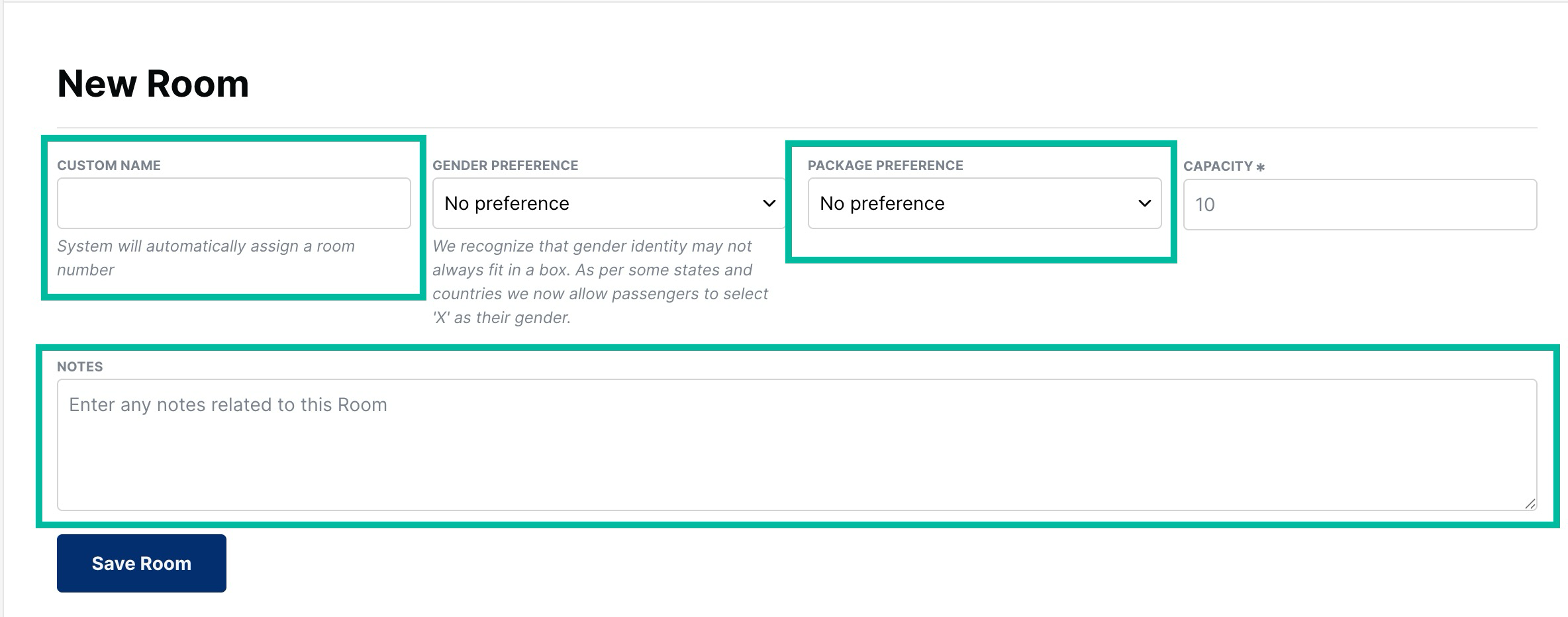 You can create a new room by setting specific rules such as gender preference, package type, and room capacity. You can even include notes pertaining to this specific room: