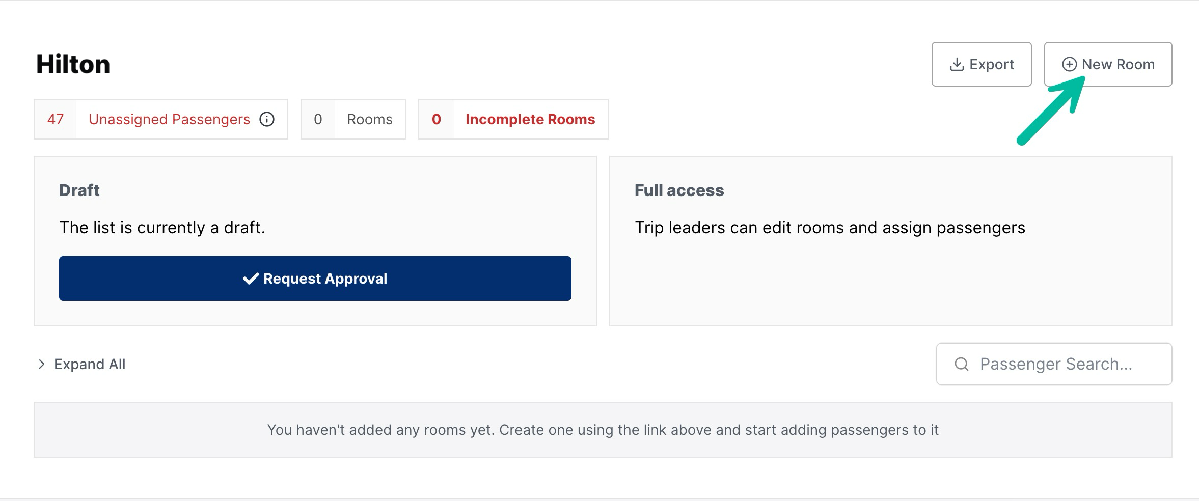 This is the most common list created in the system. It also has the most features due to the nature of hotel rooming lists. Here is a breakdown of how to make a hotel rooming list. To begin, click the New Room button in the upper right.