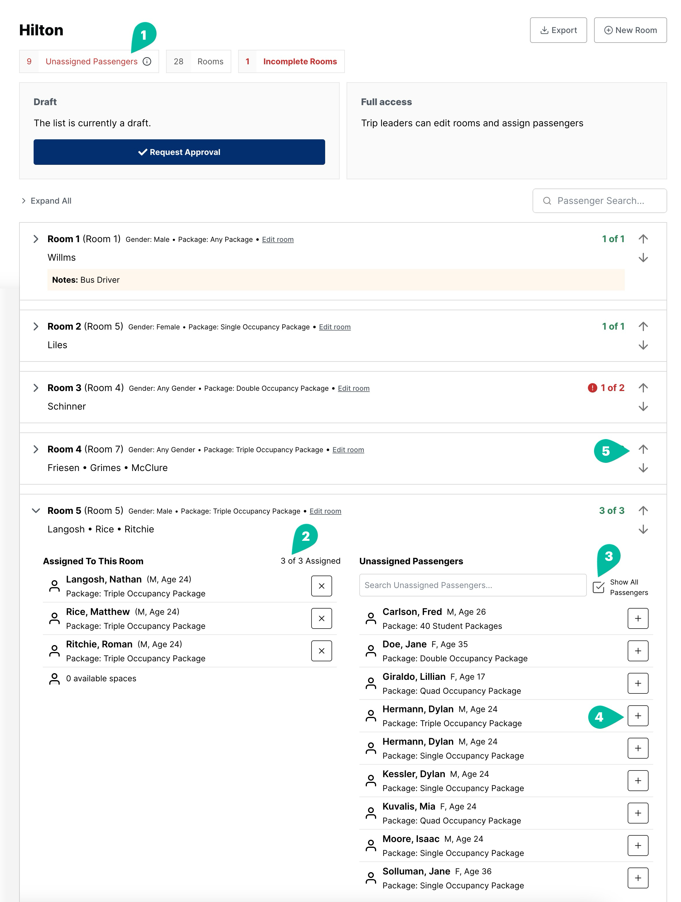 - The counter for each room will tally the number of passengers, and alert you if you have overbooked or under-booked a room. Your tour operator or travel coordinator can override those alerts if need be.