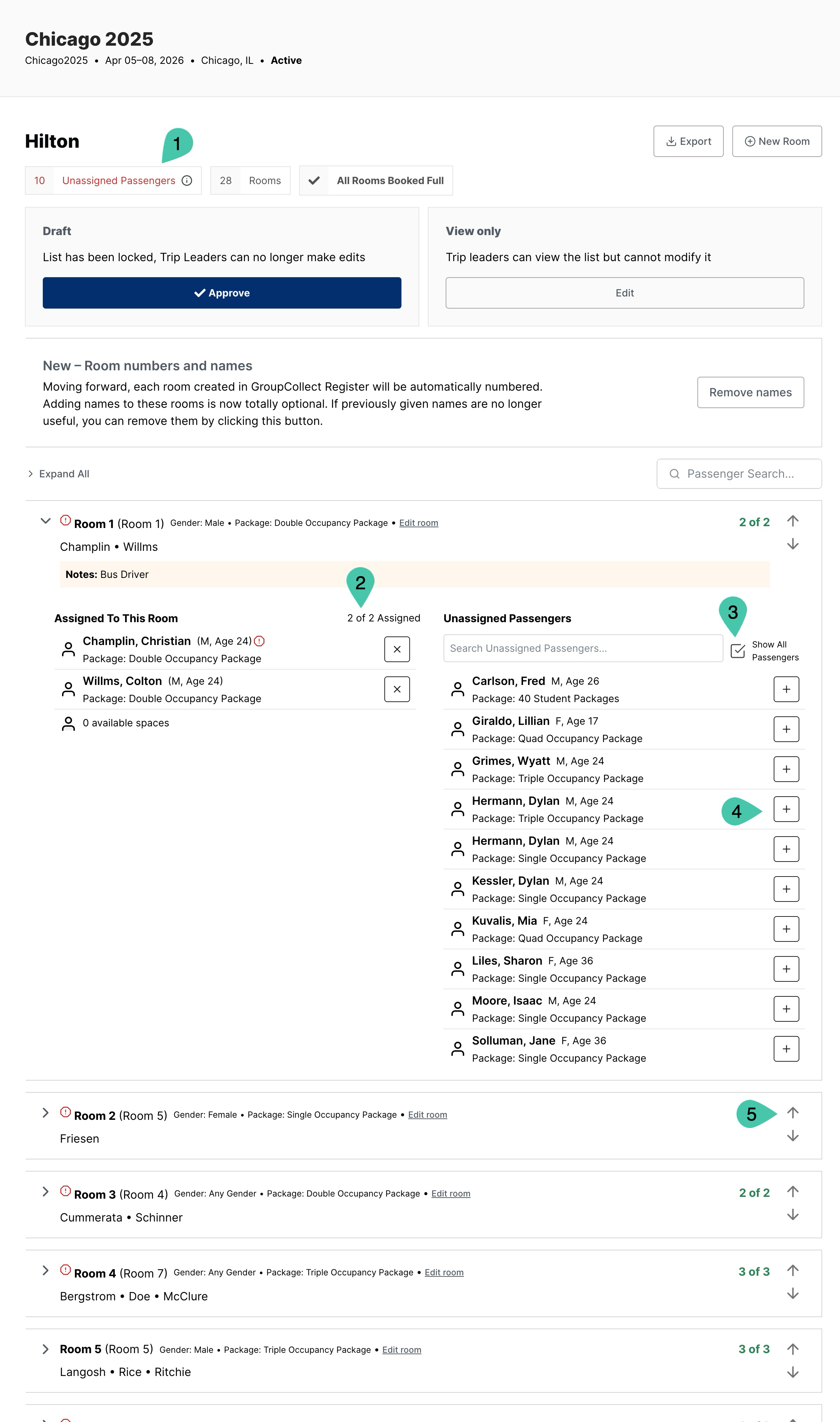 - The counter for each room will tally the number of passengers, and alert you if you have overbooked or under-booked a room. Administrators can override the alerts if need be.